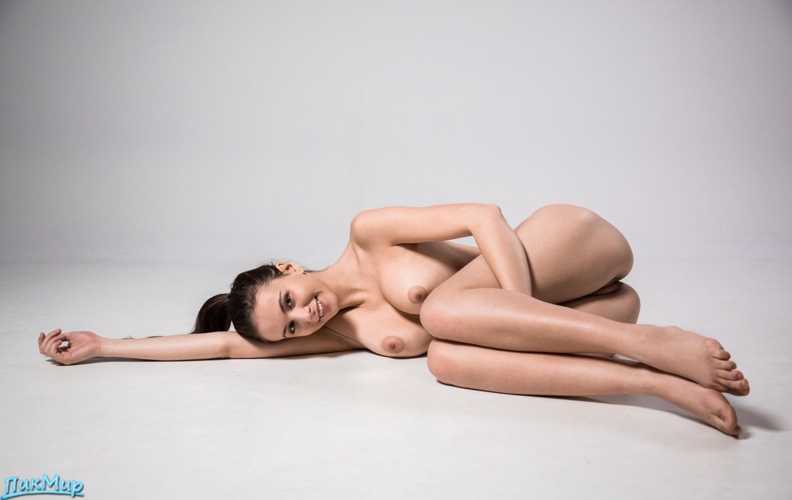 Девушка с красивыми сиськами и бритой киской занимается йогой и гимнастикой.