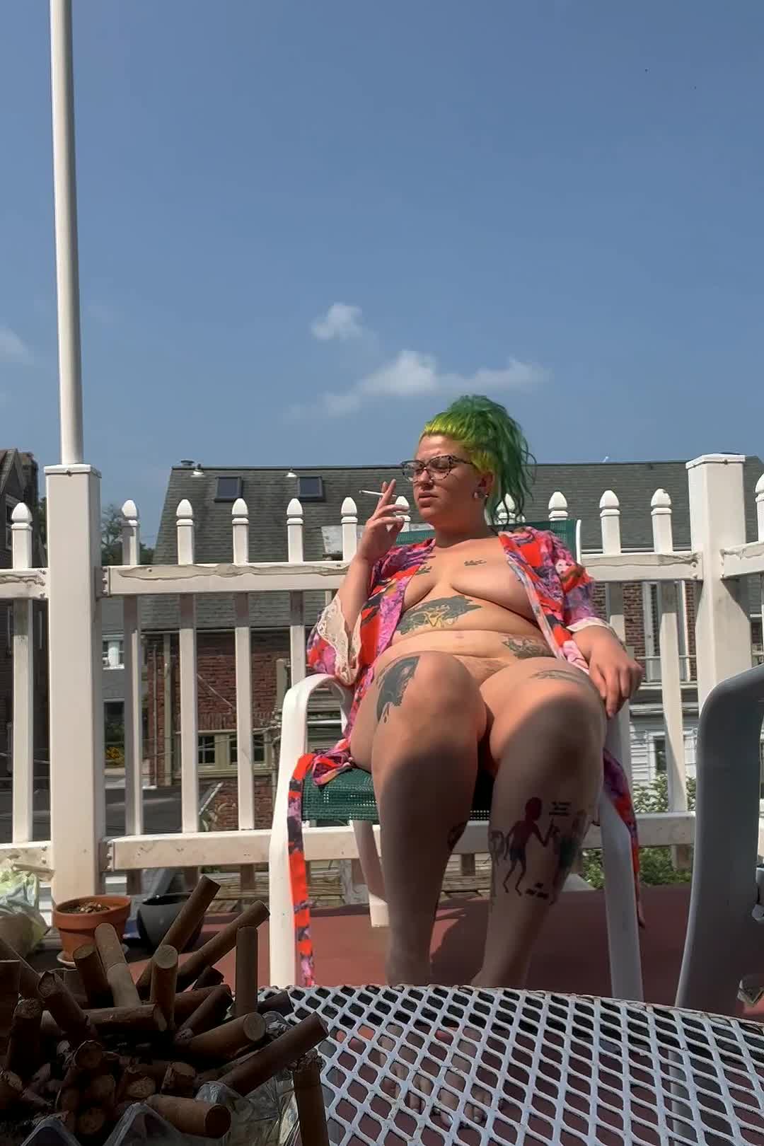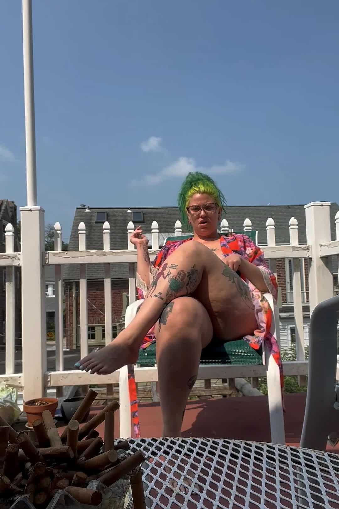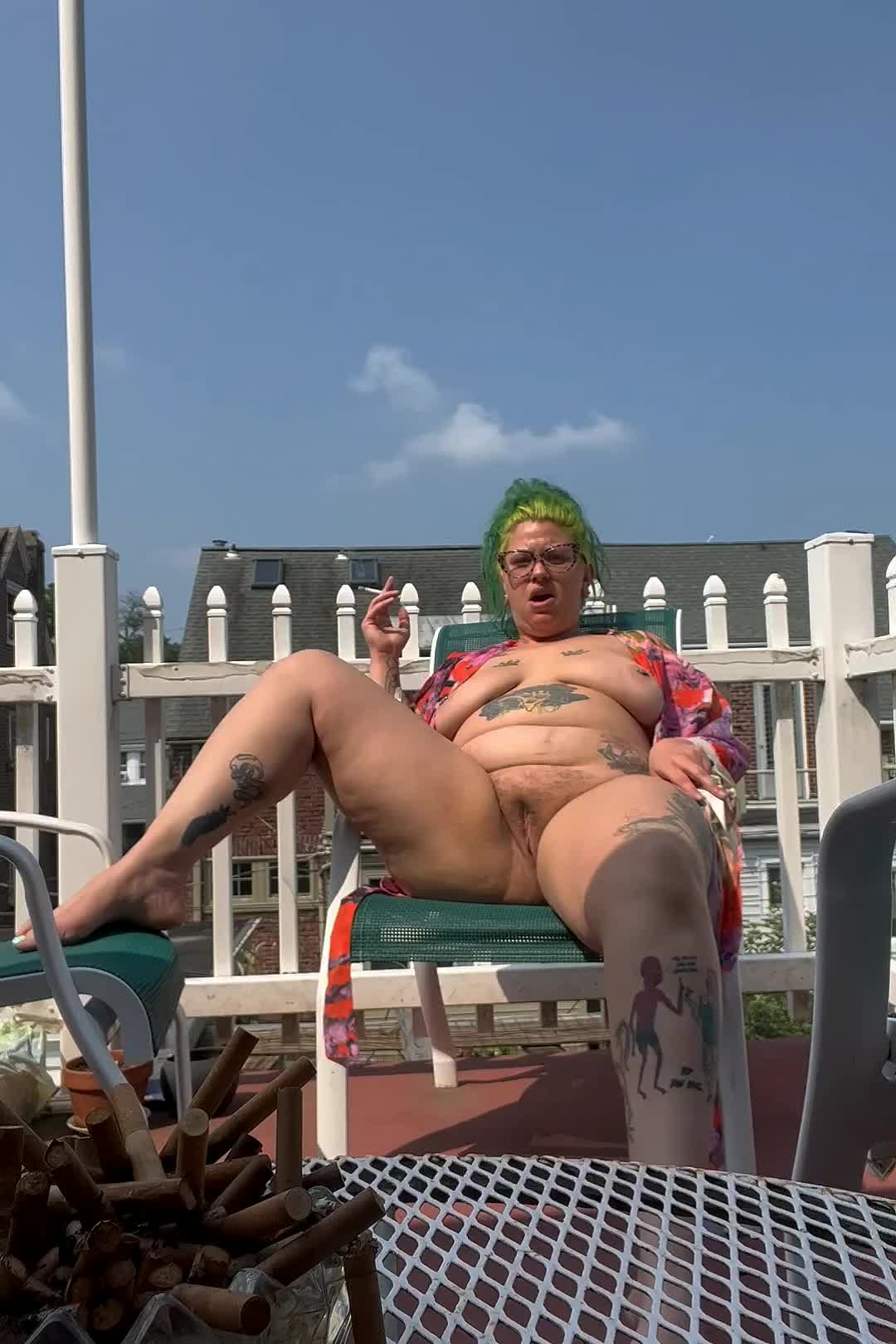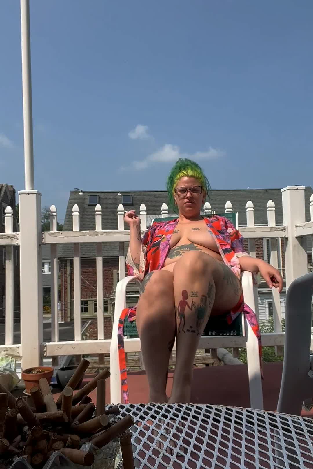 Татуированый пухляш подставила свои сиськи и пирожок летнему солнцу!