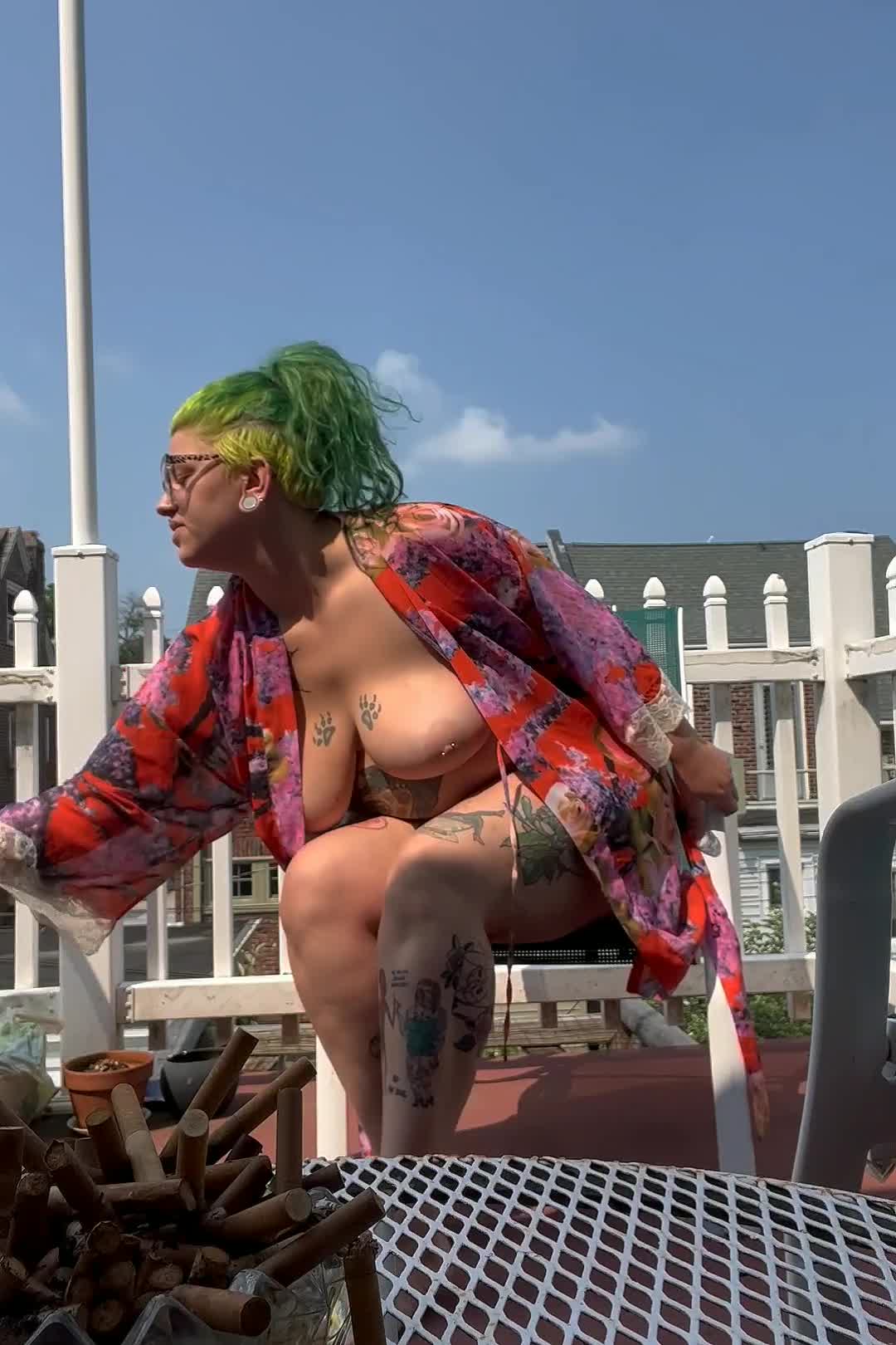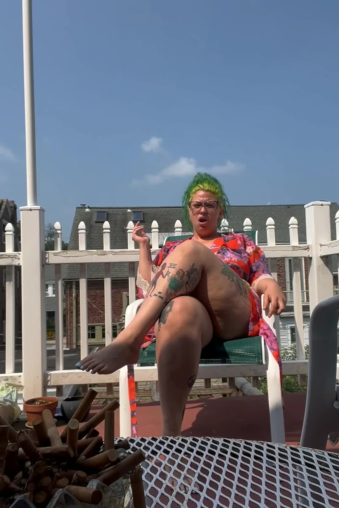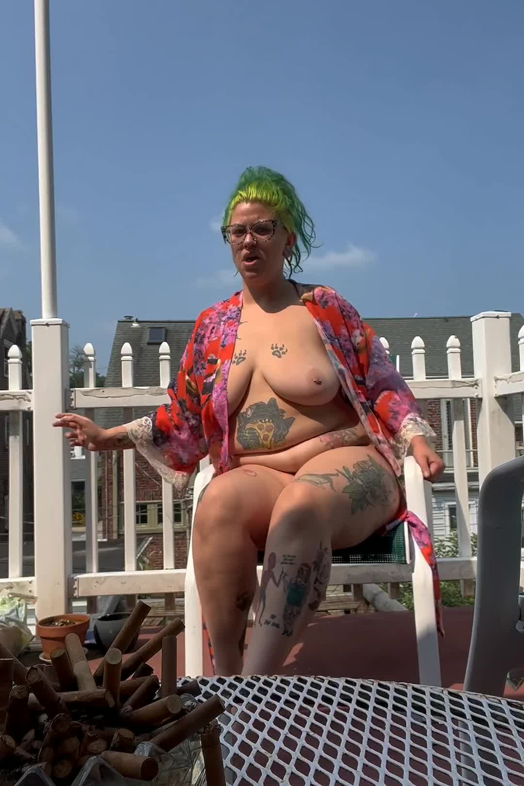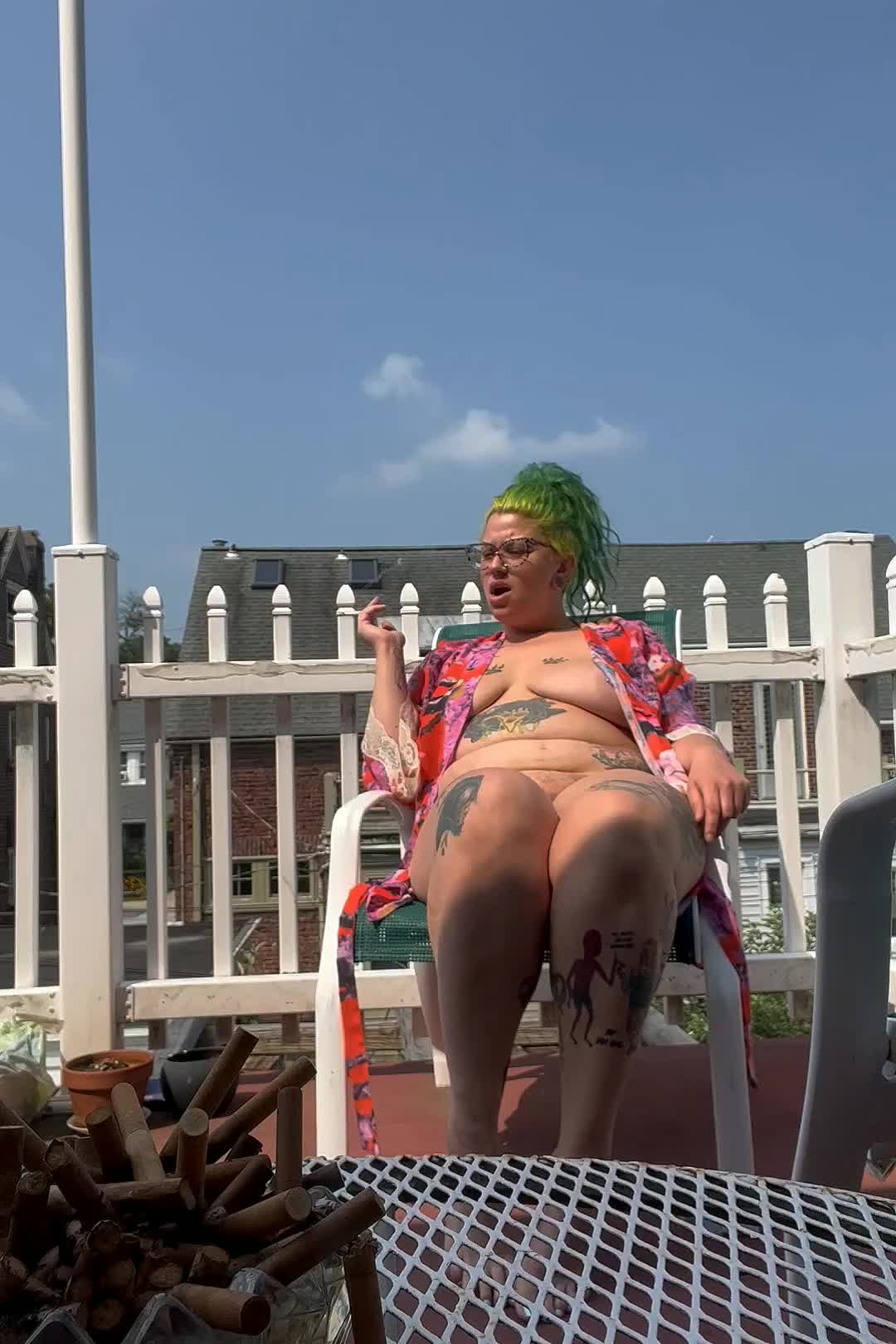 Татуированый пухляш подставила свои сиськи и пирожок летнему солнцу!