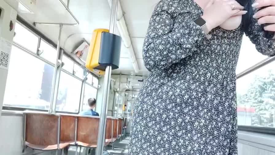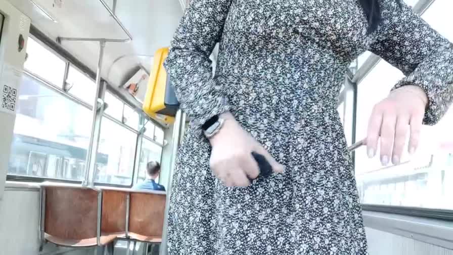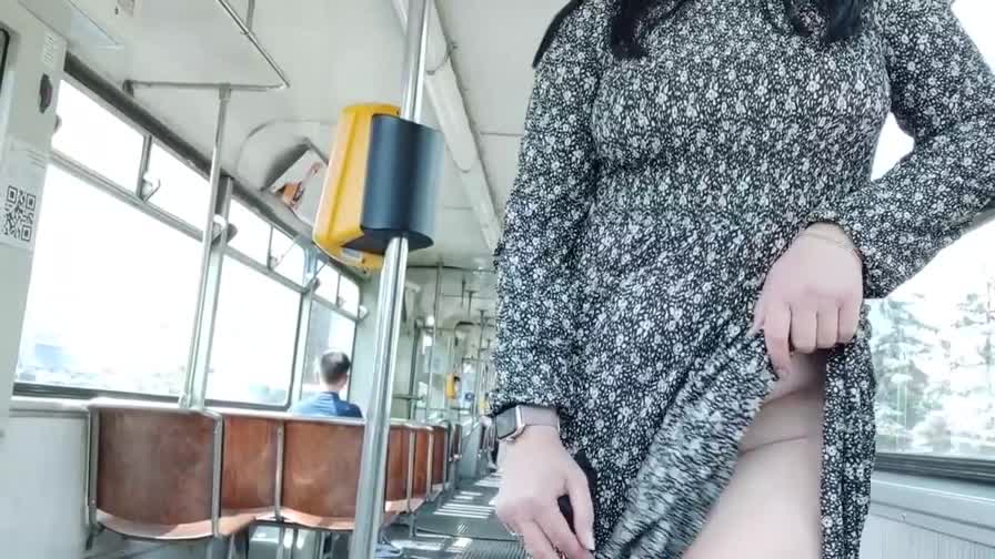 Девушка едет на общественном транспорте и периодически показывает что у неё под платьем