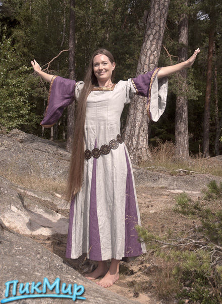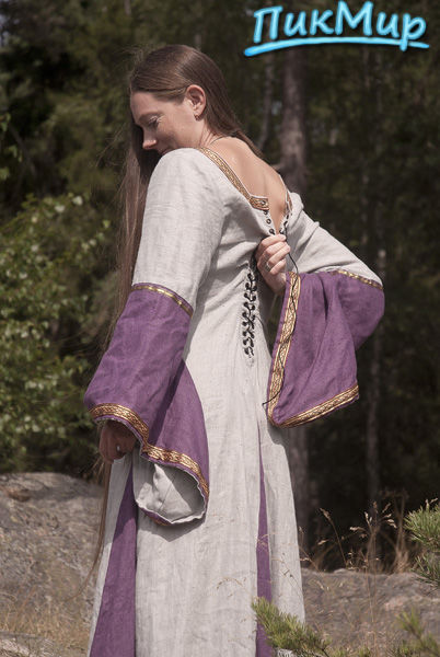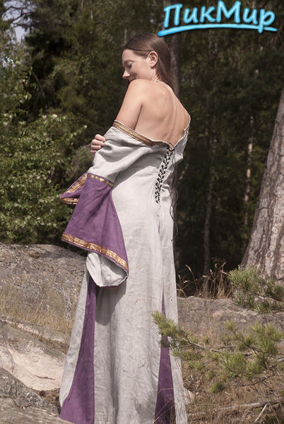 Девушка с длинными волосами и в средневековом платье раздевается донага на берегу озера.
