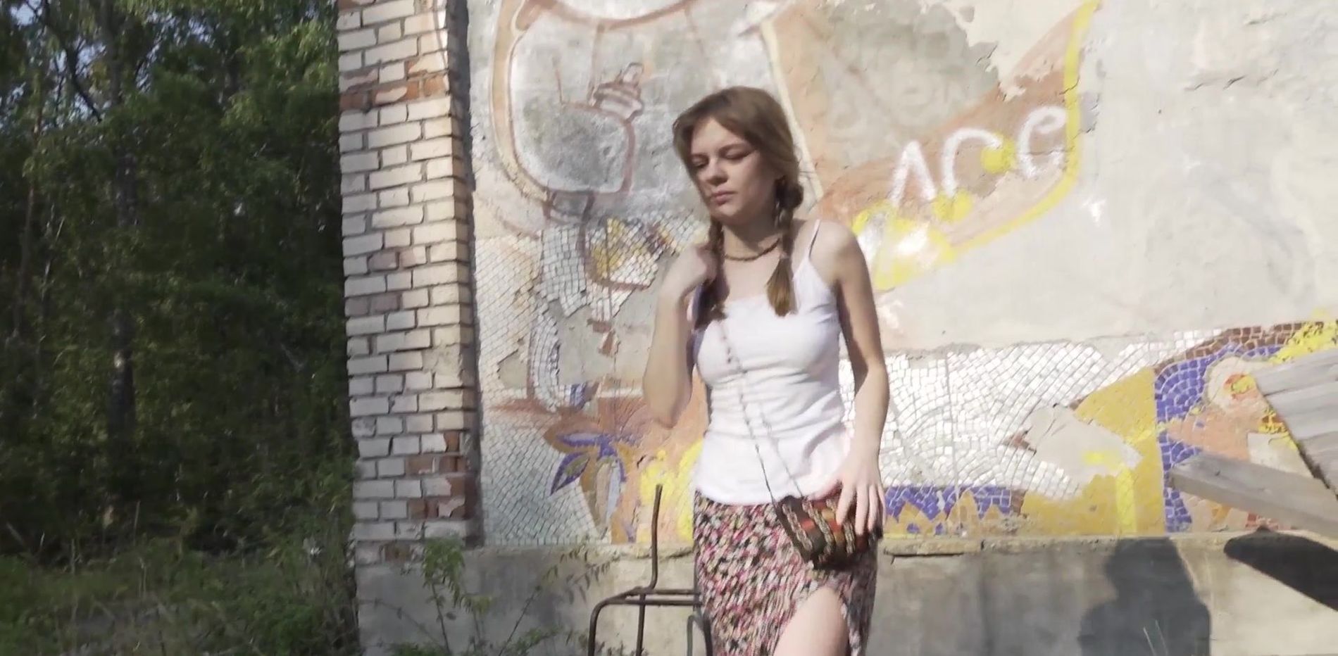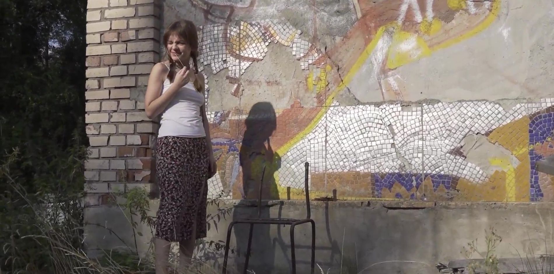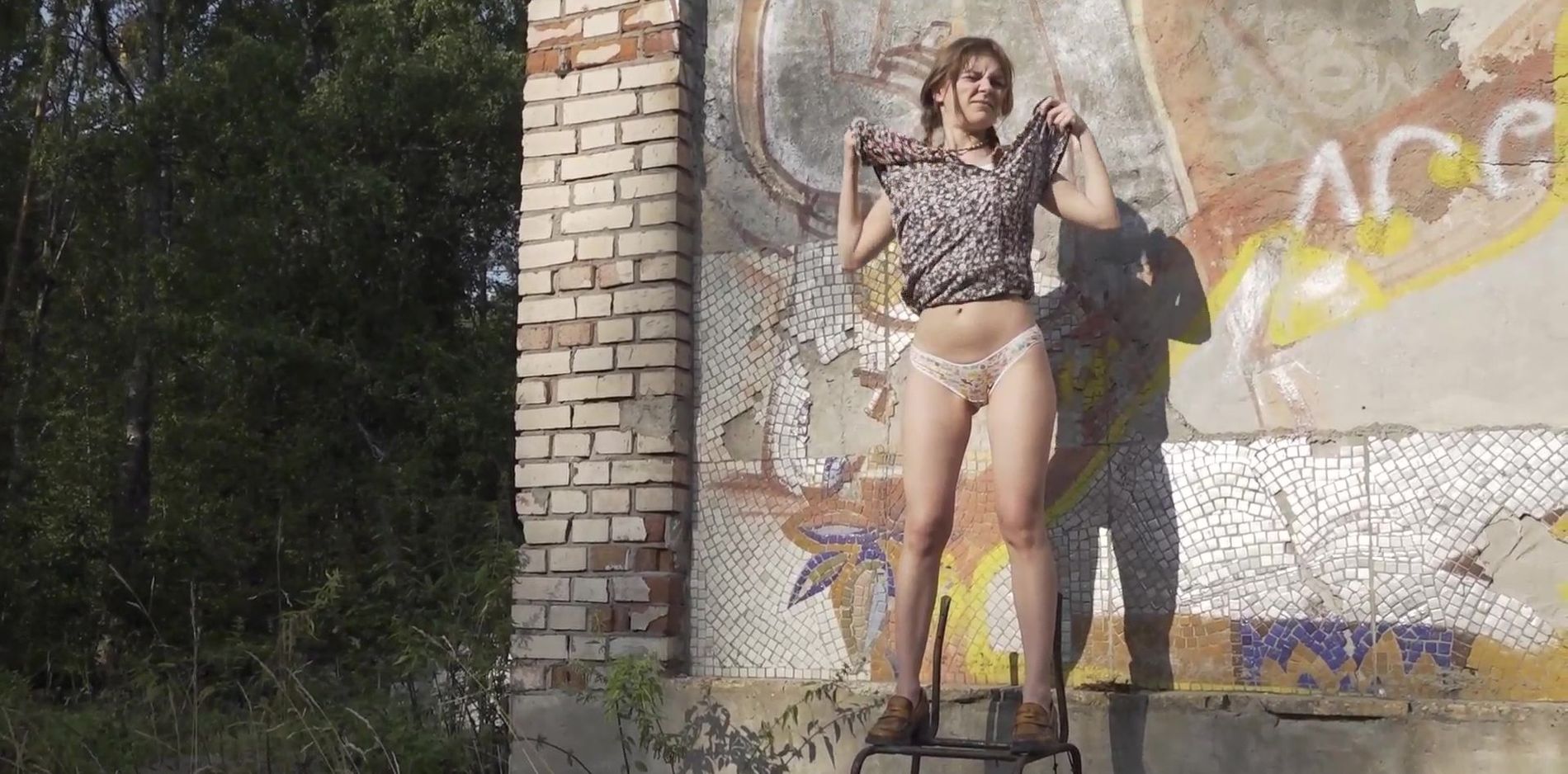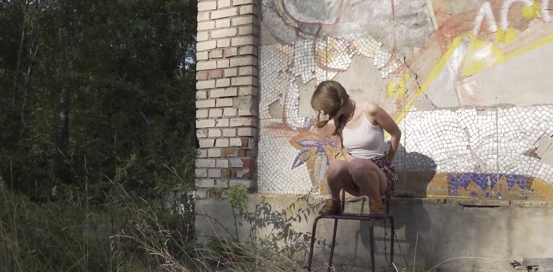 Скромная и худенькая скромняжка, почти что девочка, в тайне от всех делает струйку, показывая на камеру крупным планом свой влажный пирожок. Зачем-то залезла на сломанный стул, но... Нет большей красоты, чем пописать с высоты! ))) Прикольное видео. Приятного всем просмотра!