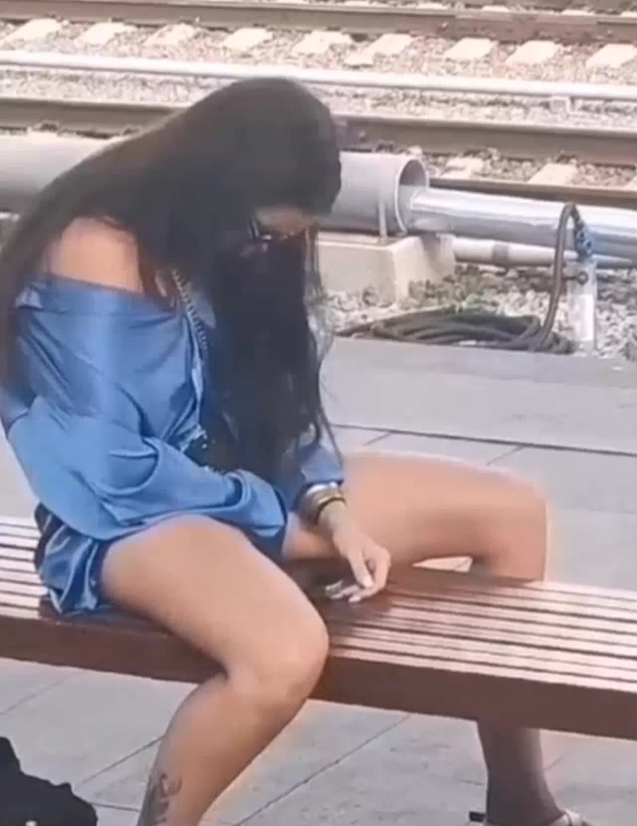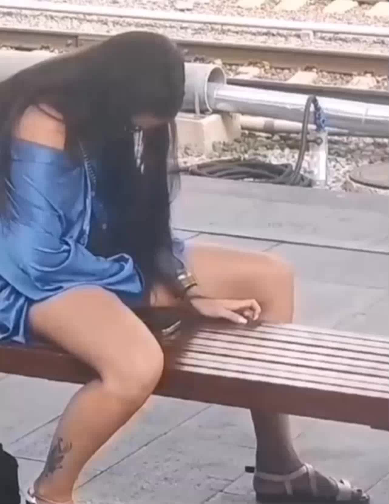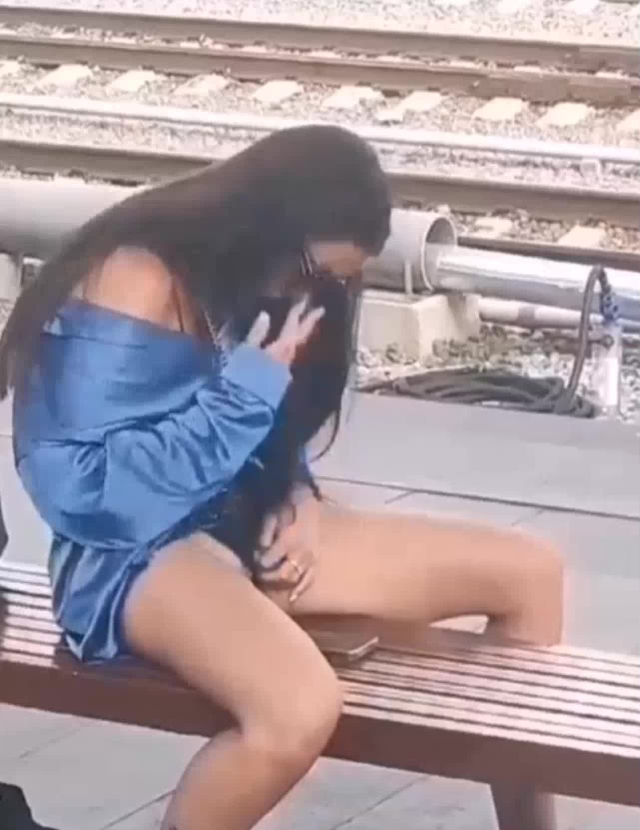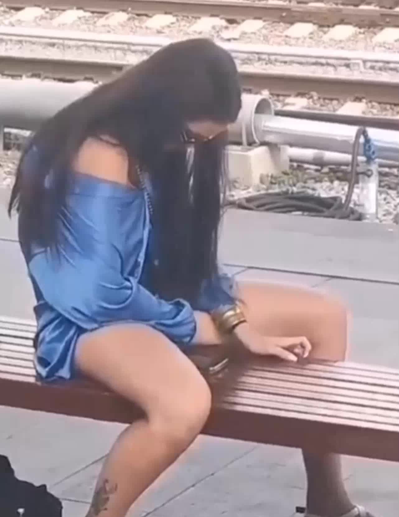 Пьяная девушка устала ждать поезд на остановке и решила немного подрочить.