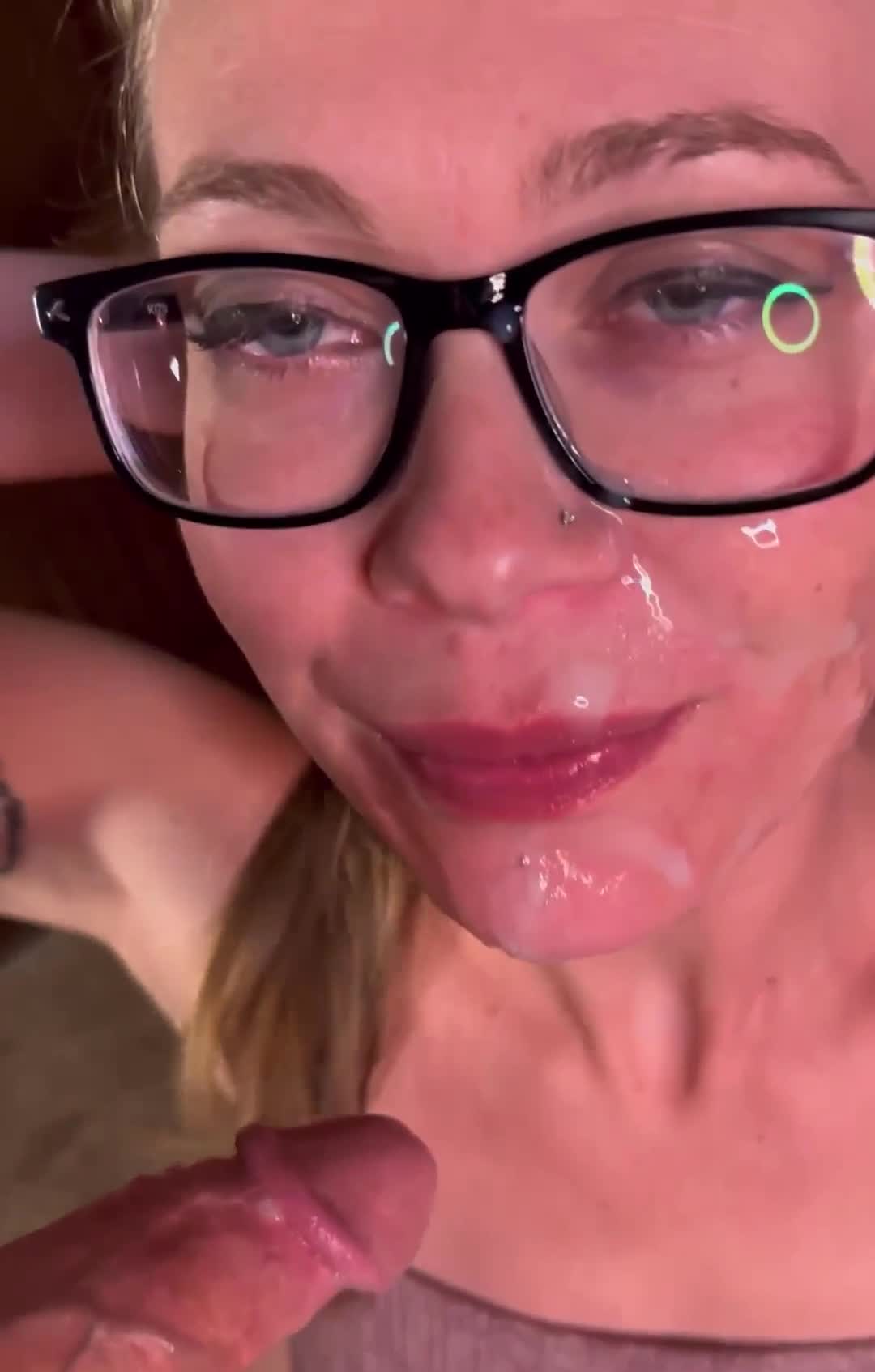 Довольная и радостная баба много спермы отсосала себе на лицо и в рот.
