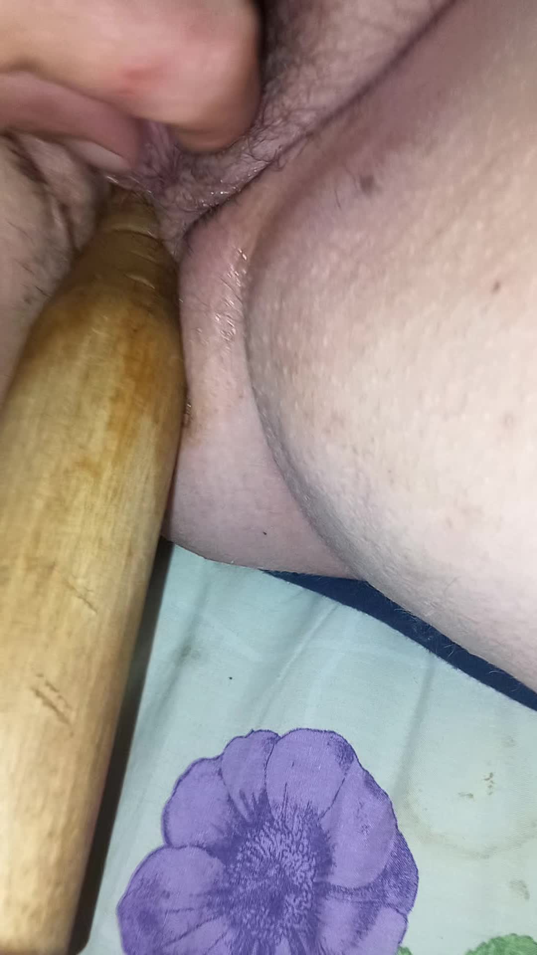 Мужчина трахает толкушкой старую женщину в волосатую писю и попу!