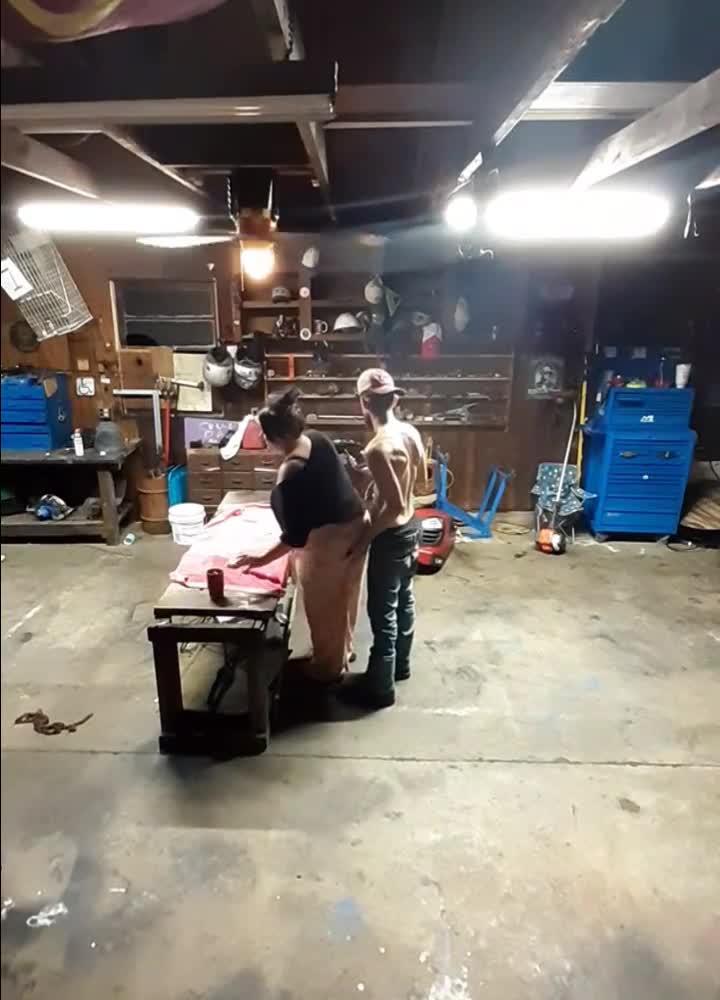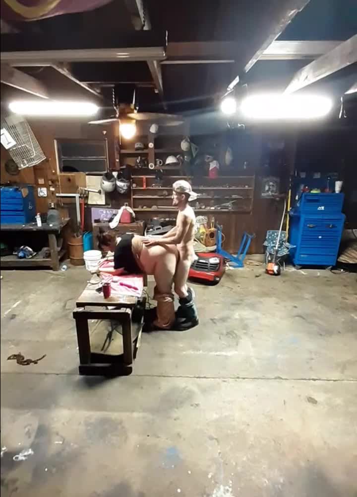 чувак кладет телефон в потайное место и снимает на видео, как его толстая дама делает ему минет, а затем трахает ее в гараже, где он работает.