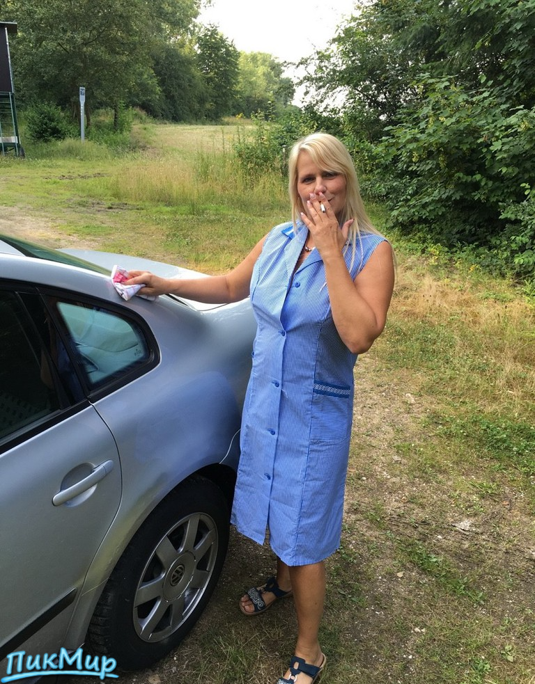 Женщина на природе показывает стриптиз возле машины с сигаретой