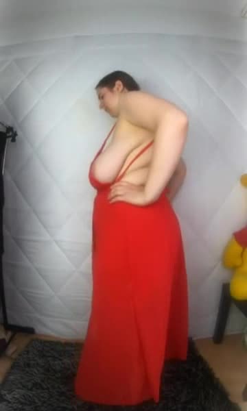 Грудастая брюнетка примеряет свои новые платье перед камерой