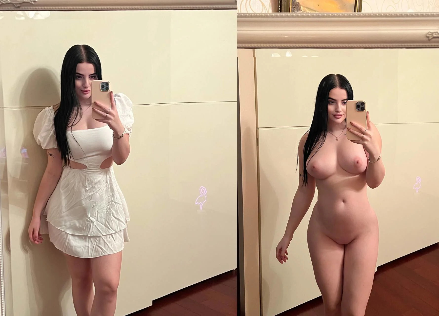 тёмноволосая девушка показывает своё молодое тело и прелести