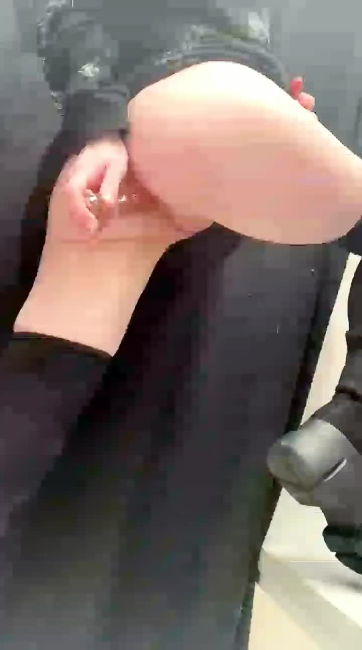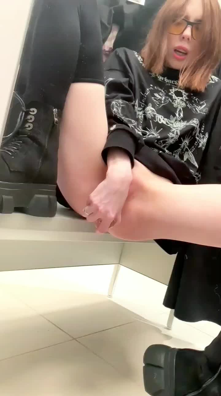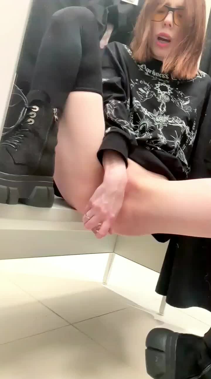 Девка зашла в примерочную, сняла трусы, вытащила пробку из попки. И дилдаком промасировала свой анус!