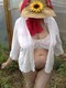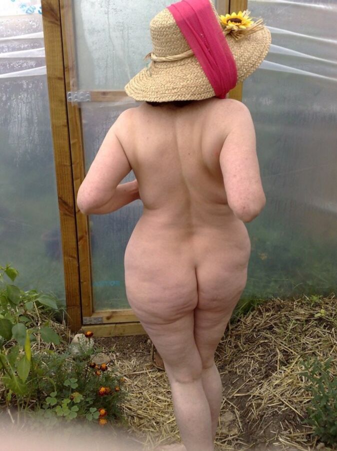 Зрелая женщина с сексуальным телом стыдливо прячет лицо под соломенной шляпой.