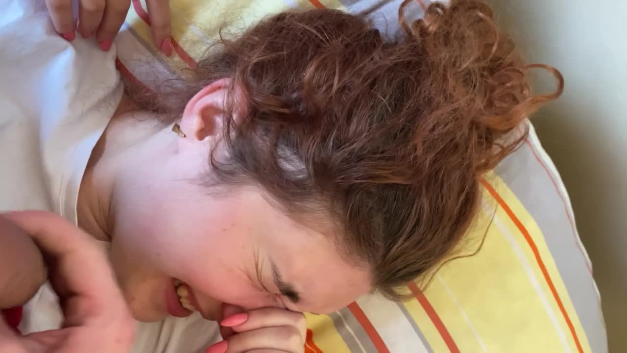 Видать, увесистая колотушка. Девочка аж зажмуривается и отворачивается.