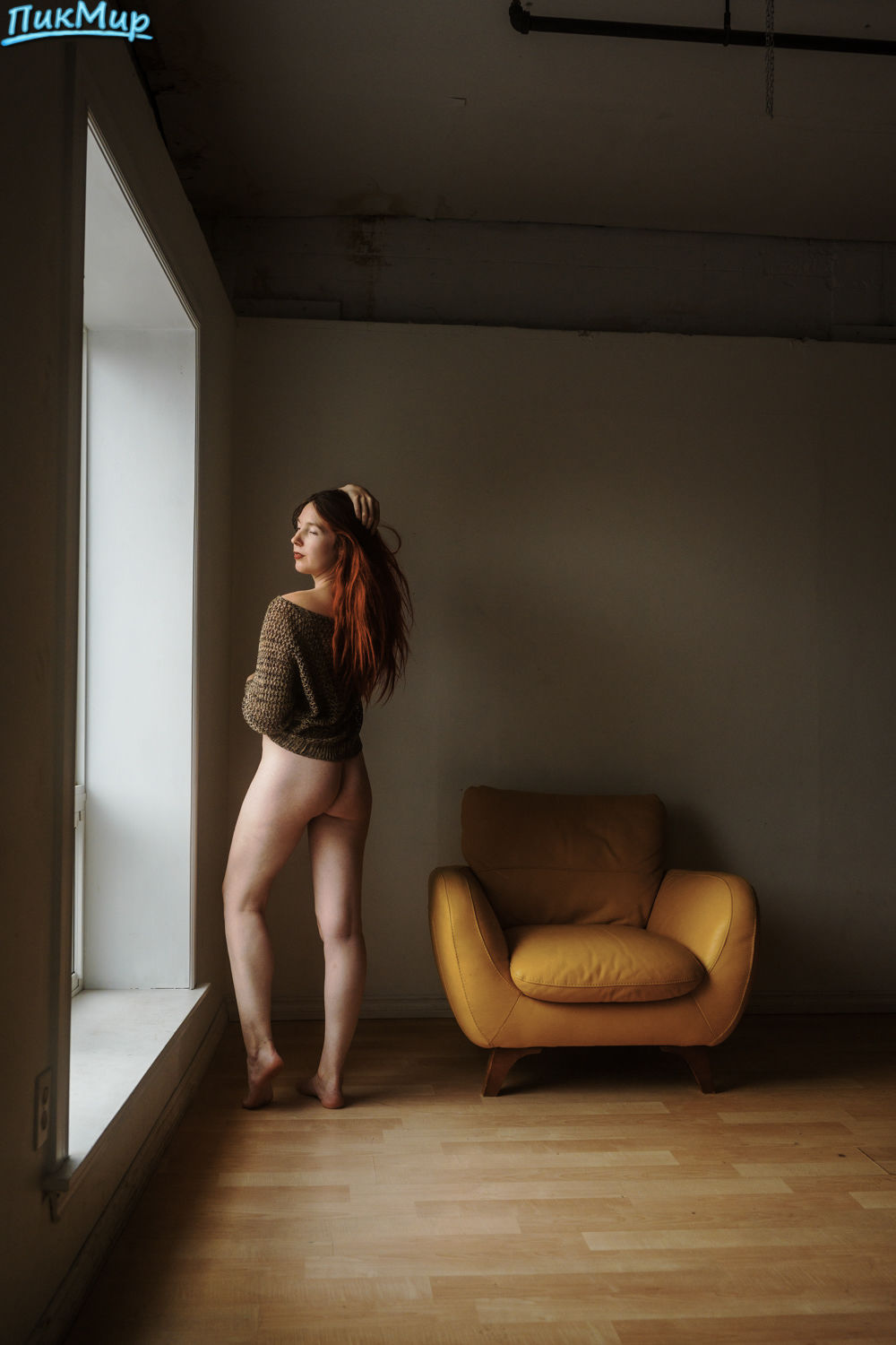 приятная эротика с красивой женщиной, позирующей обнаженной у окна и на диване, освещенном солнцем через окно.