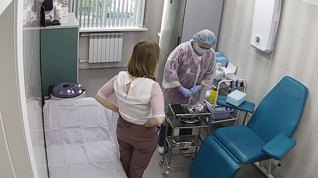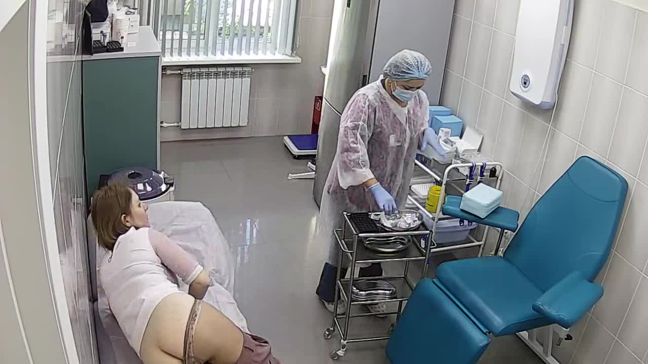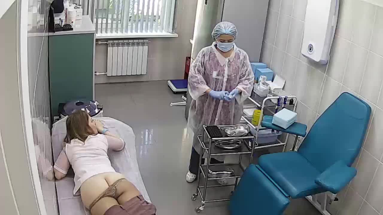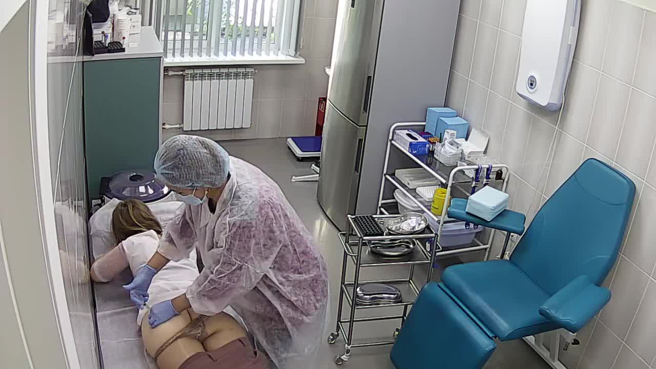 В процедурном кабинете поликлиники медсестра делает инъекцию в ягодицу молодой девушке не подозревающей ,что это снимается на скрытую камеру.