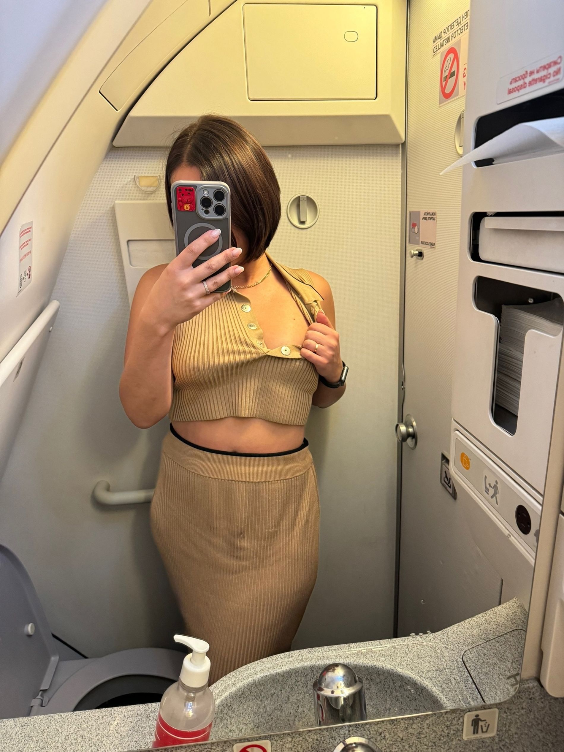 Незабываемое ощущение, когда мы с мужем трахнулись в самолете, правда ужасно неудобно, но дико возбуждает, а ещё муж буквально вырвал член изо рта и обкончал меня всю попало и на волосы и на грудь и на лицо. Хотела так и пойти в салон, поскольку была ночь, темно и многие уже спали, да и самолёт был полупустой, но все же волосы и лицо вытерла салфетками, а на груди хорошенько размазала и надела толстовку, без лифчика, такой кайф