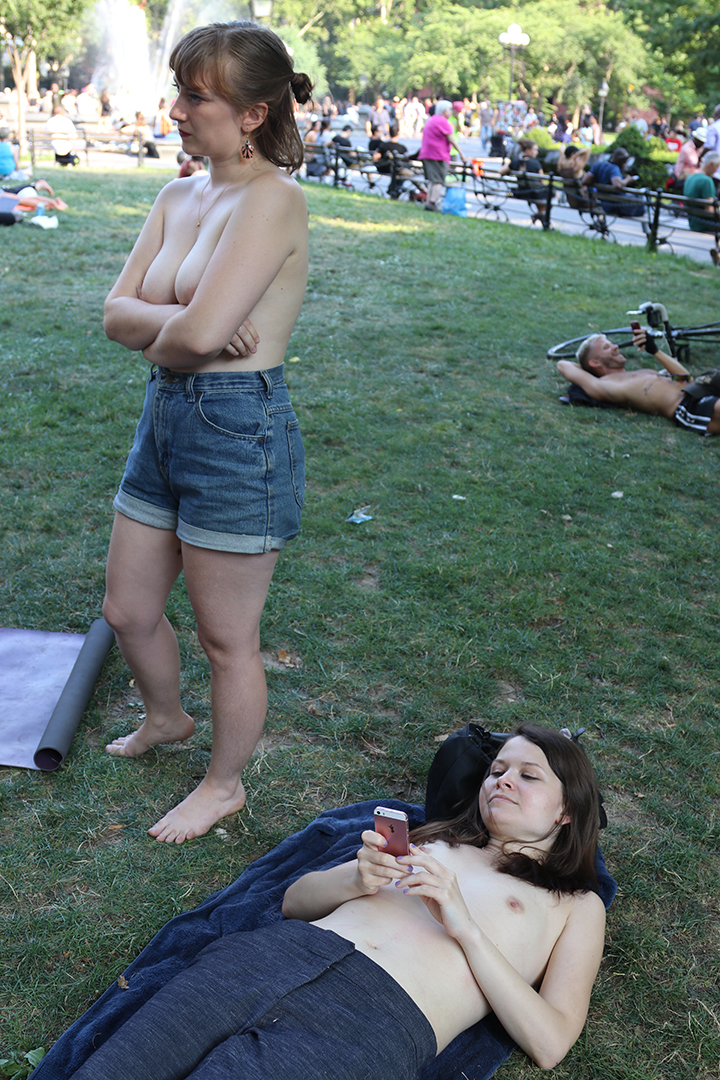 девушки отдыхают в парке с обнаженной грудью
