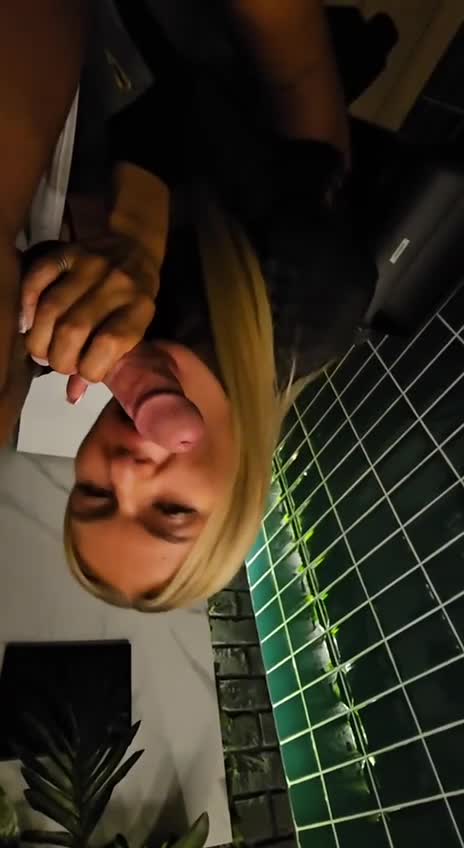 Жадно отсасывает,красиво. А за дверью слышны разговоры парней и девушек.