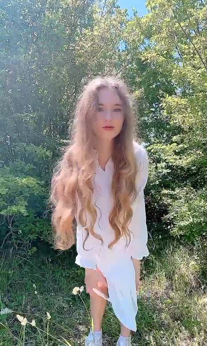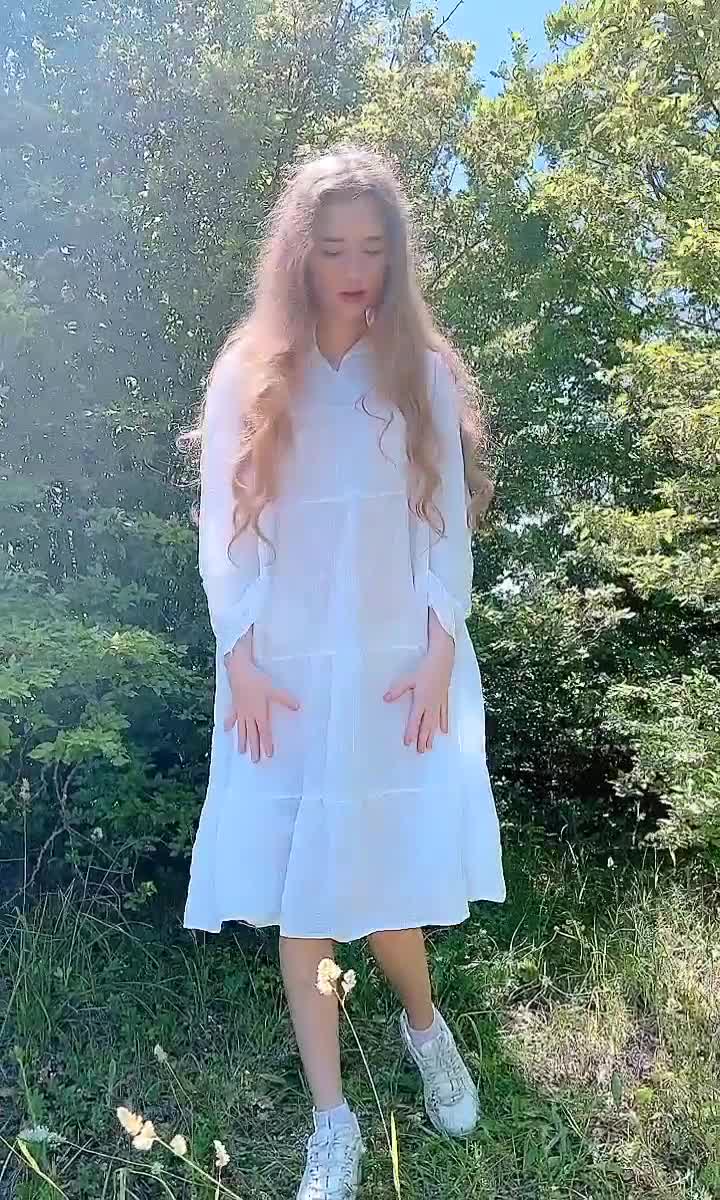 красивая девушка в саду показывает свои прелести под платьем