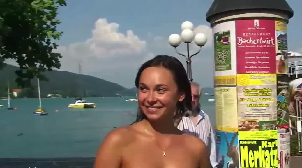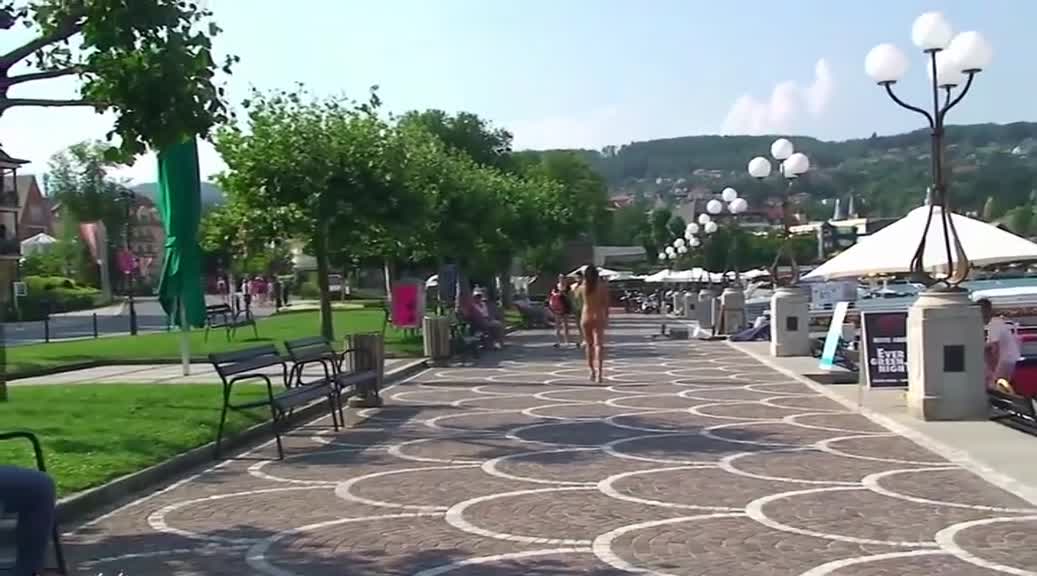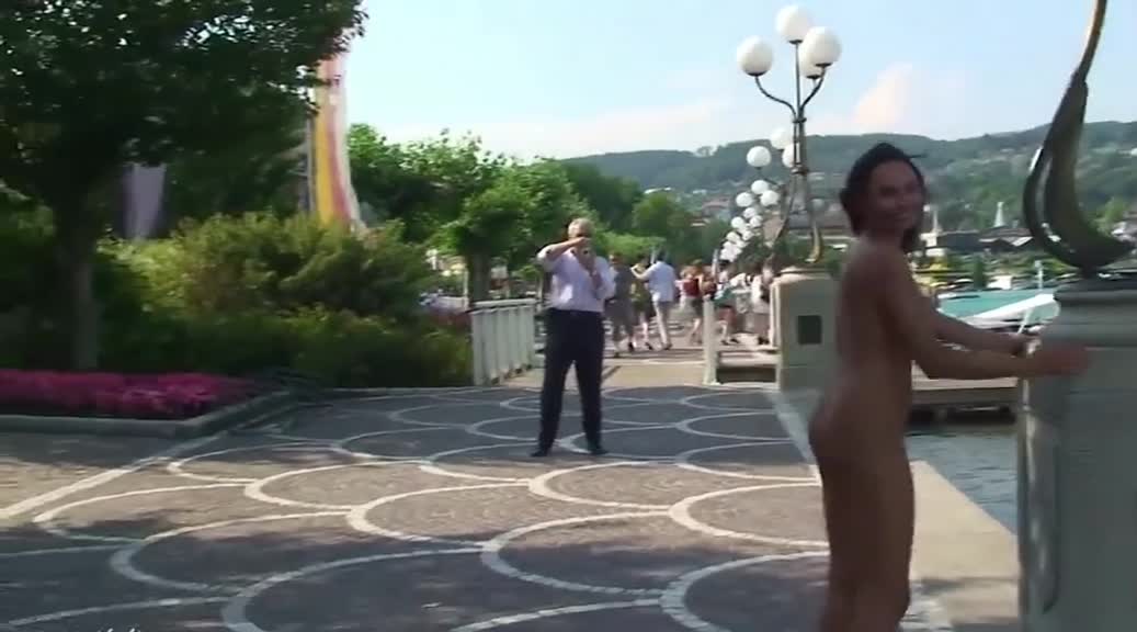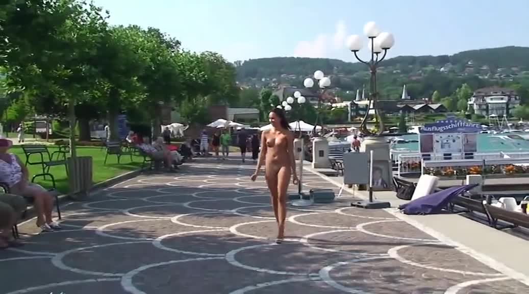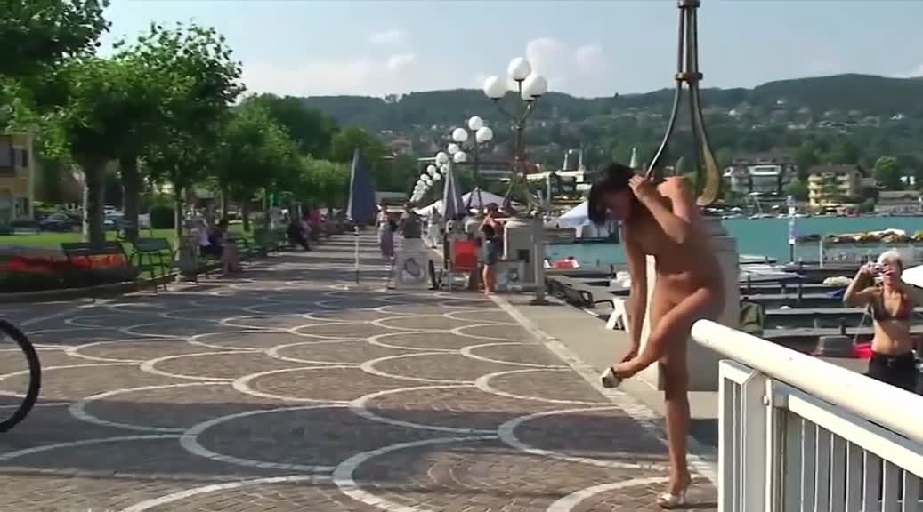 Стройная красивая украинка гуляет по итальянской набережной в полдень, одетая в одни только босоножки.