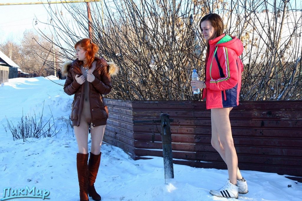 Две деревенские девахи разделись и зажигают возле водяной колонки