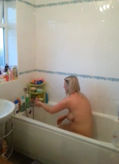 Зрелая женщина моется в ванной и мастурбирует до оргазма при помощи руки,пальцев и геля для душа.