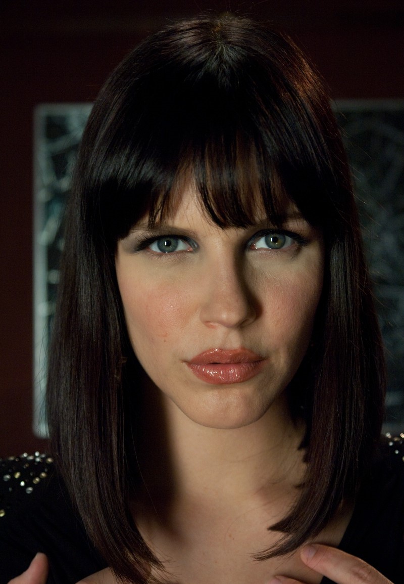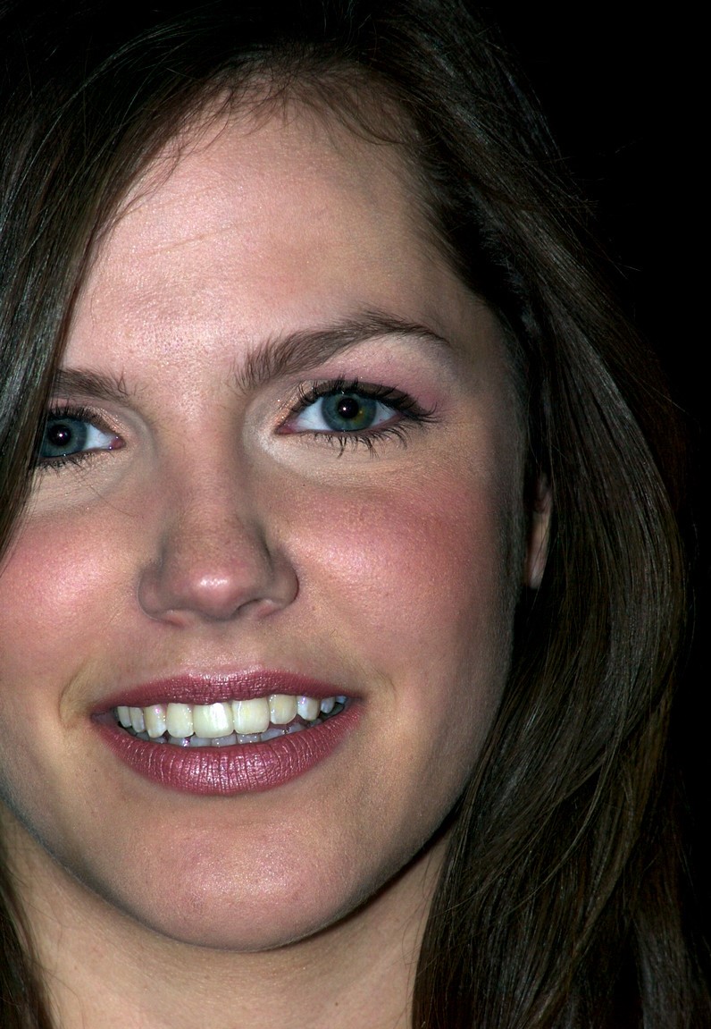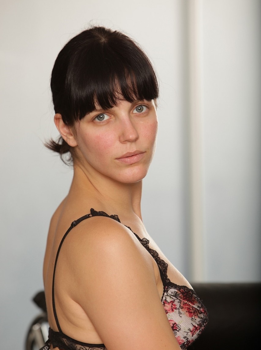 Пока не улыбается, взгляд хищницы, но улыбка обворожительна, небритая киска ей больше идёт.