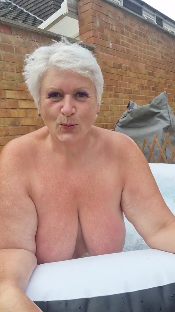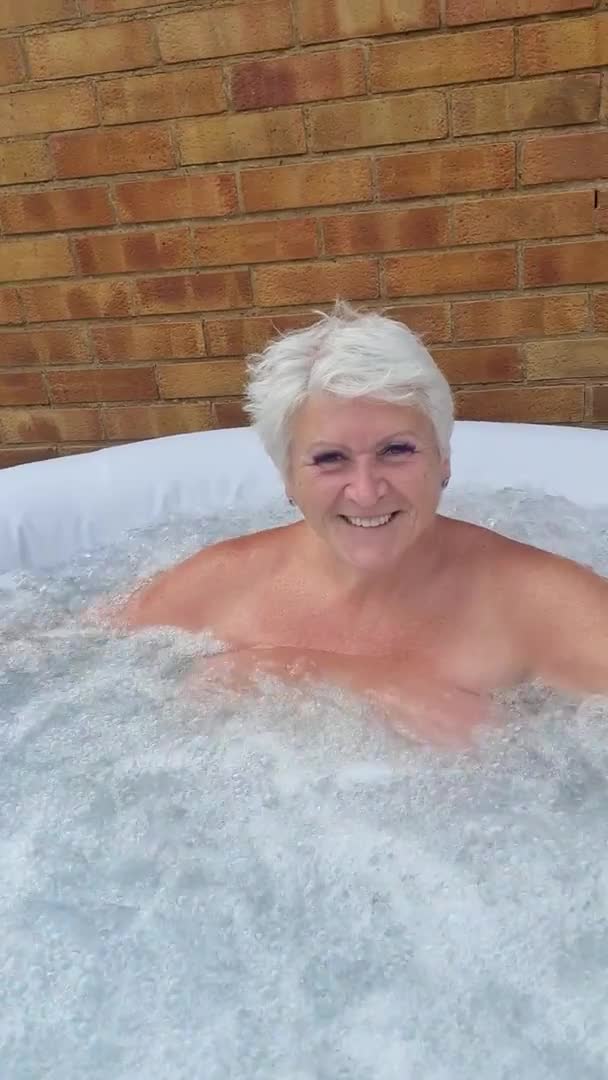 Седая женщина отдыхает обнаженной в джакузи за своим домом.