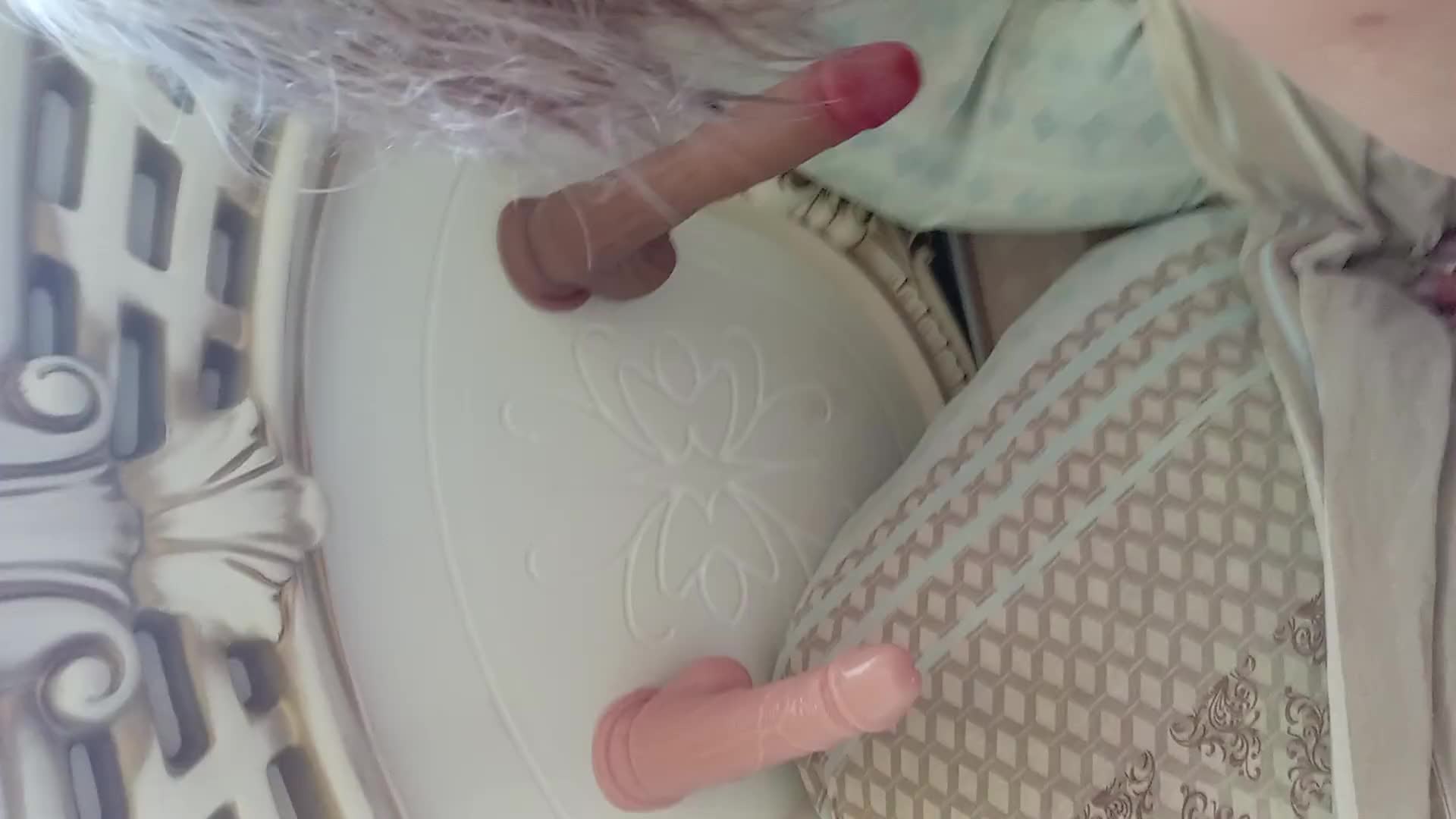 Мужик раком трахает зрелую женщину в киску,перед лицом которой закреплены два дилдо!