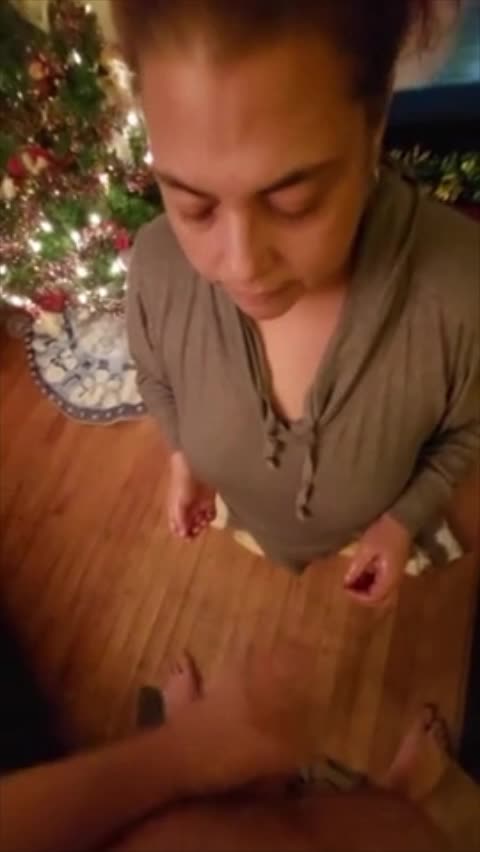 Пышная зрелая женщина сосет большой член парня под Новый год и получает финал на грудь!