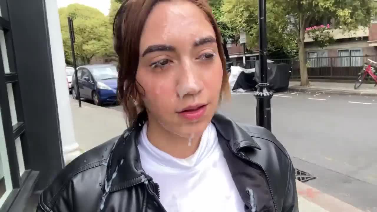 Девушка получила три мощных спермовых выстрела на лицо, а затем пошла по городу с лицом, покрытым спермой.