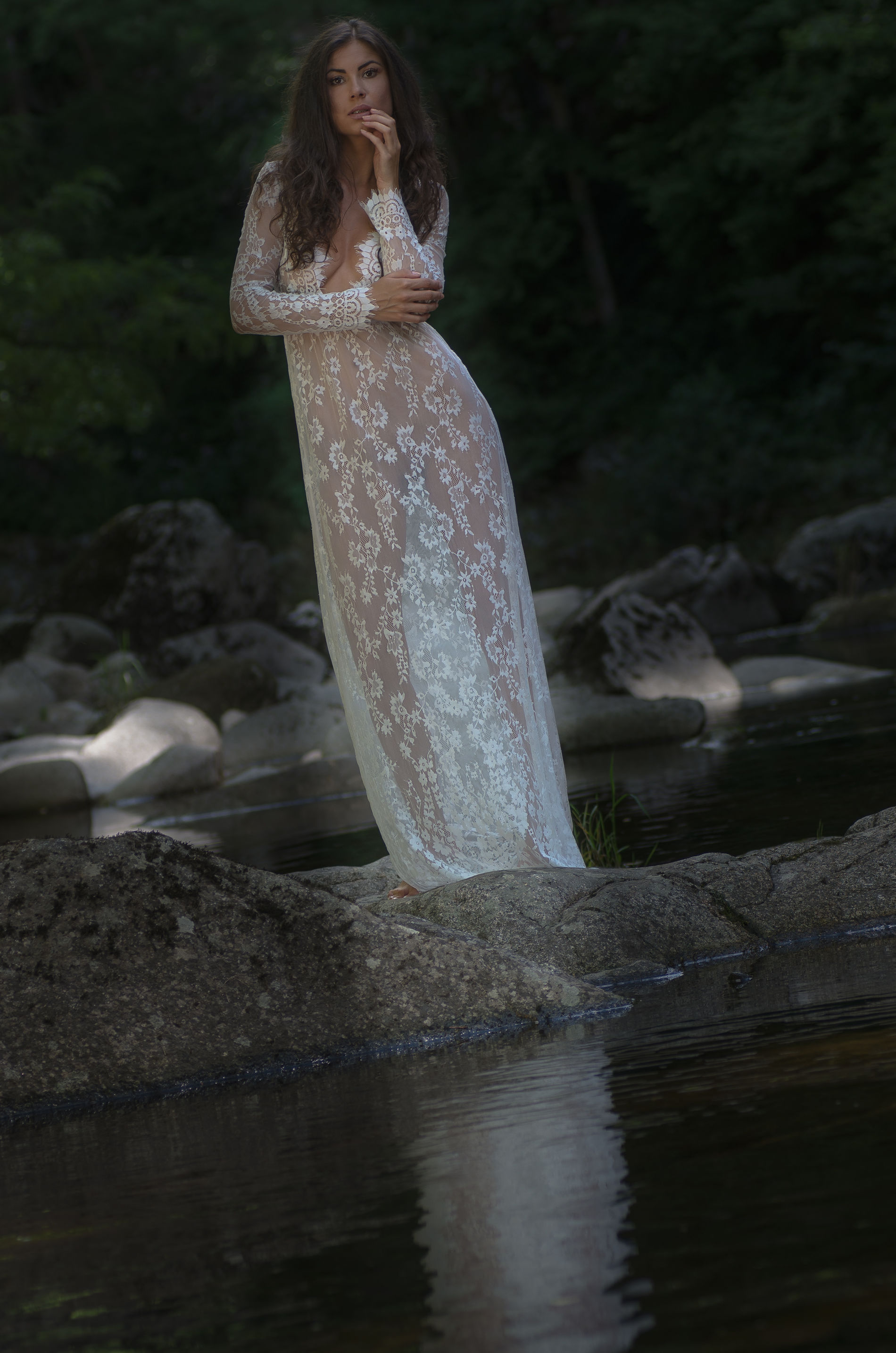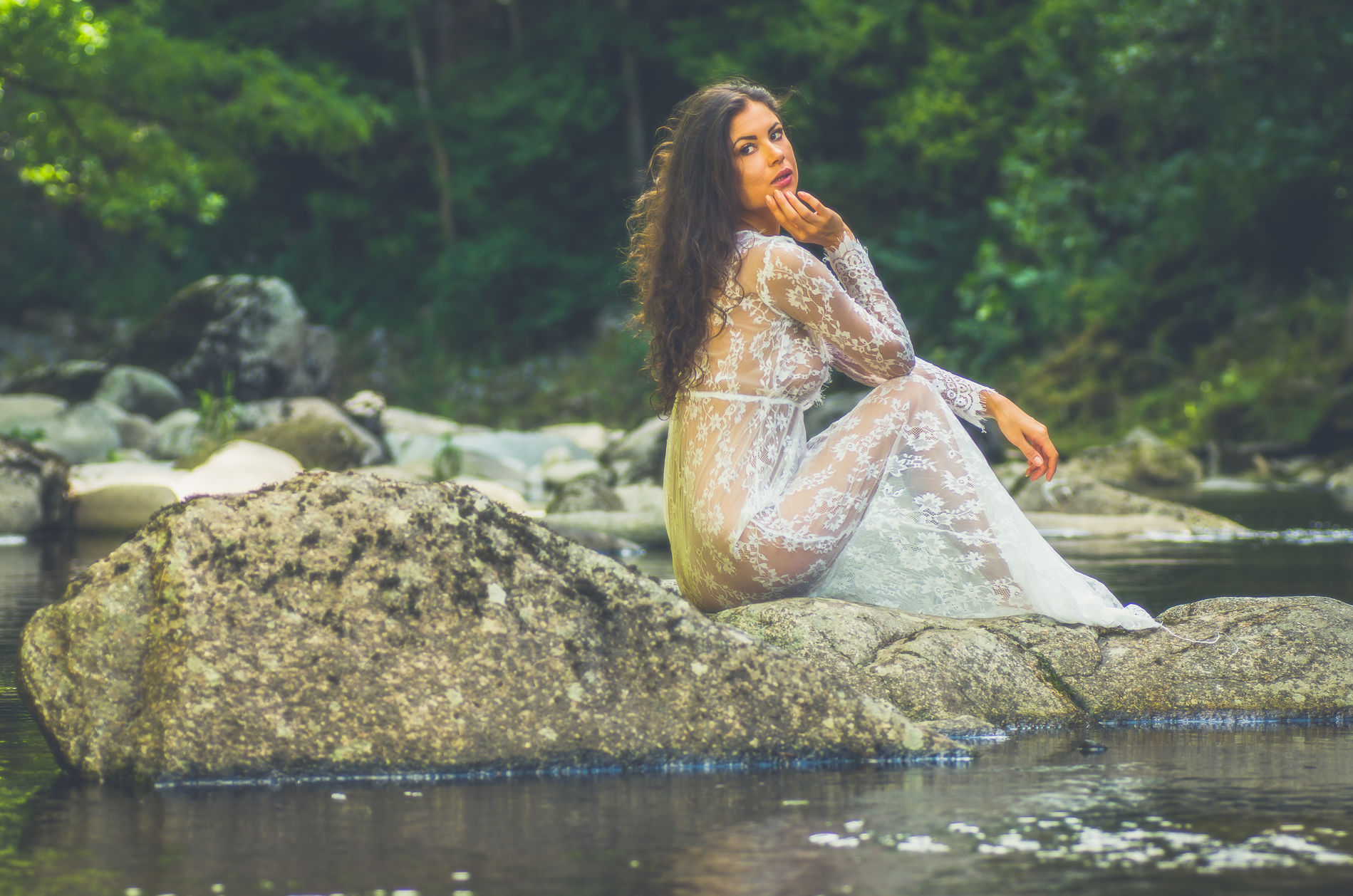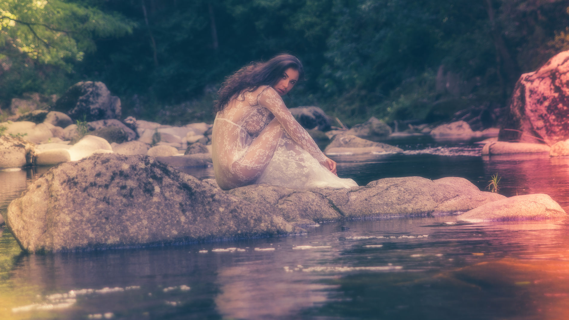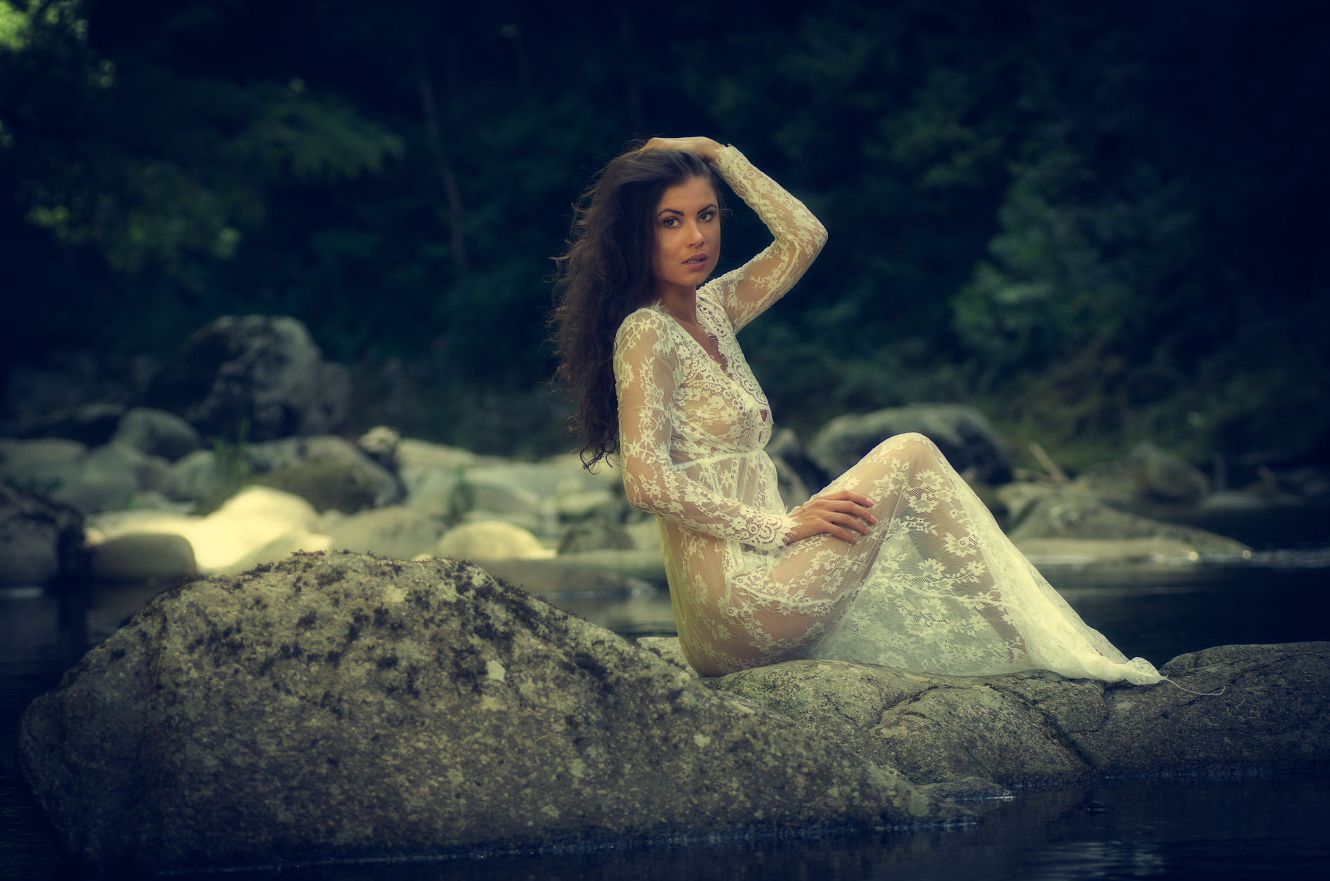Её обнажённая фигурка, сидя на камне, смотрится интересно и классно. А в белом прозрачном одеянии. Это просто секси. Видение на берегу.