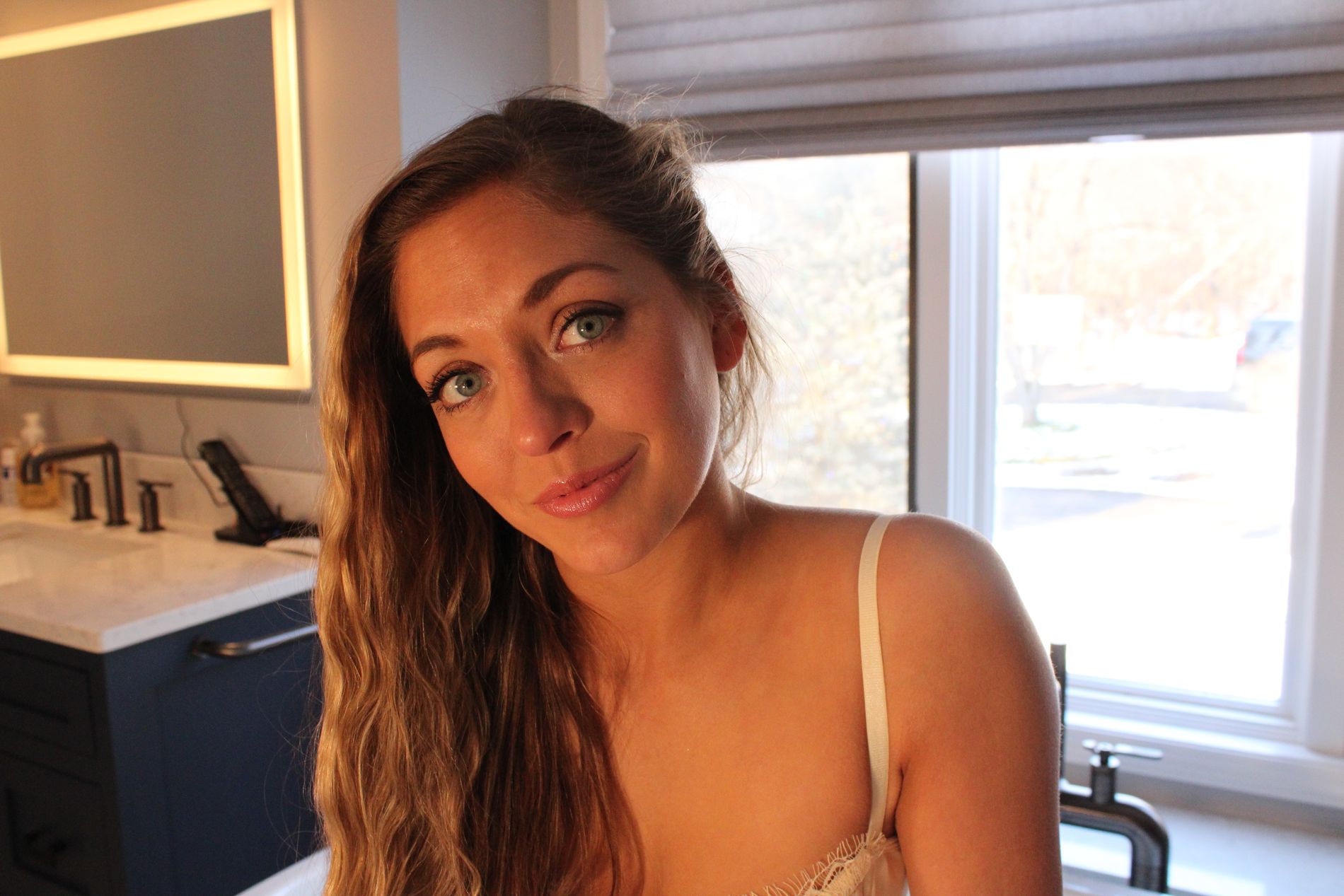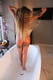 Блондинка с татуировками позирует в роскошно украшенной ванной комнате.