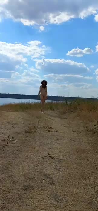 Стройная красотка в шляпе дефилирует голенькой на природе.