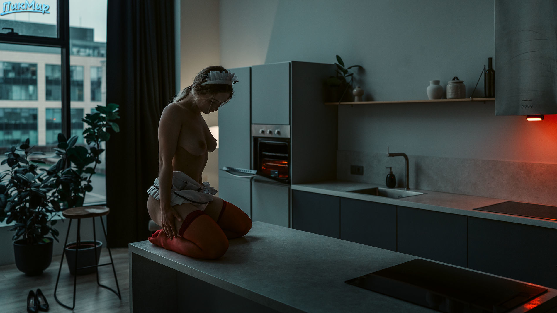 Молоденькая и сексуальная в образе поварихи позирует на кухне