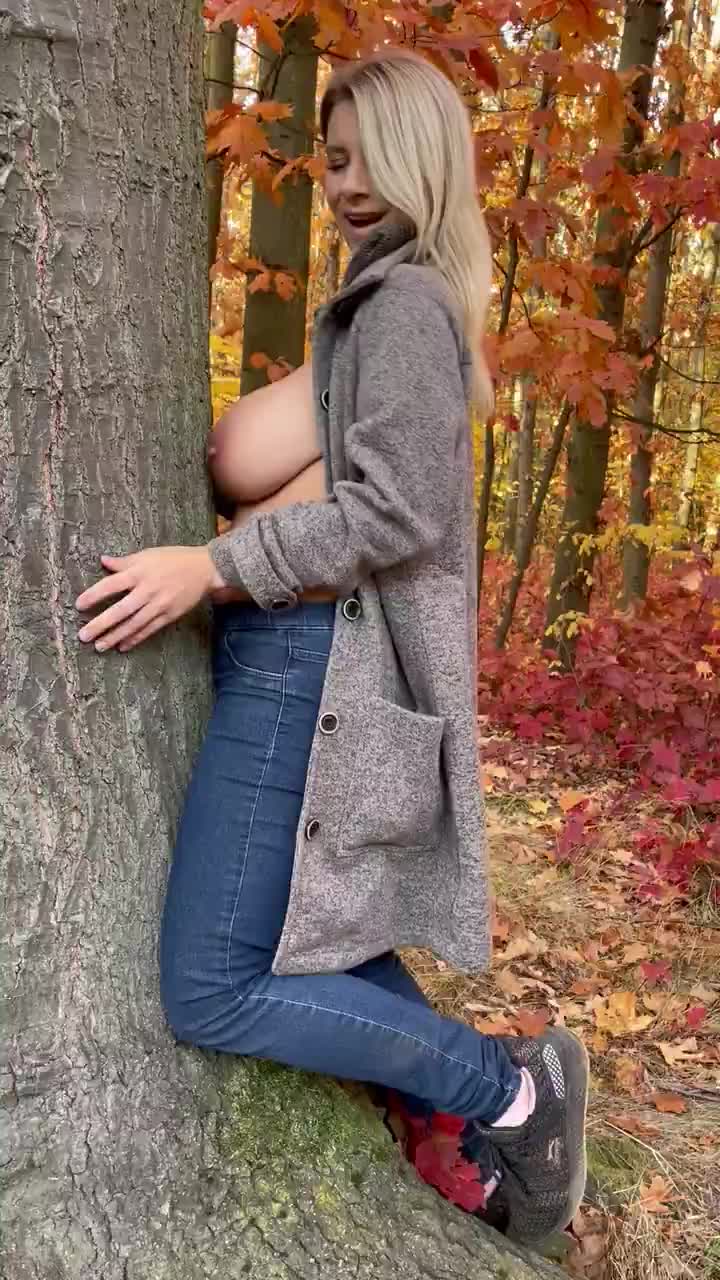 Красивая чешская женщина демонстрирует свою грудь у дерева.