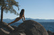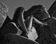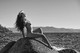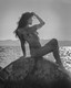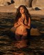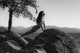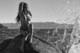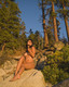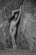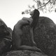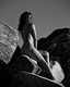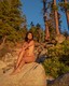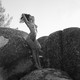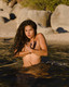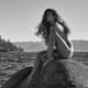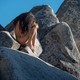 Красивая девушка позирует среди больших камней.